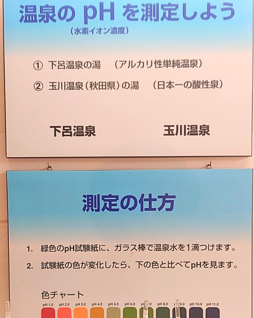 もちろんそういった説明パネルもありますが、ここでは実際に泉質の違うお湯を見比べて酸性度を計ることができます。