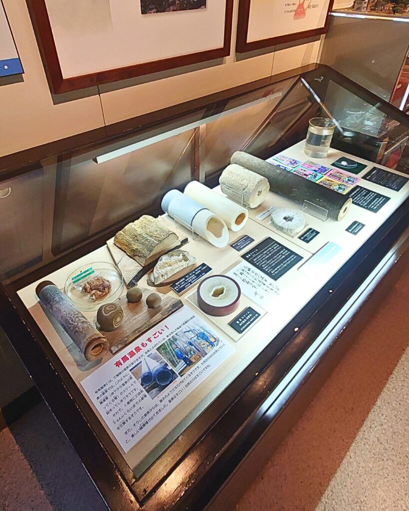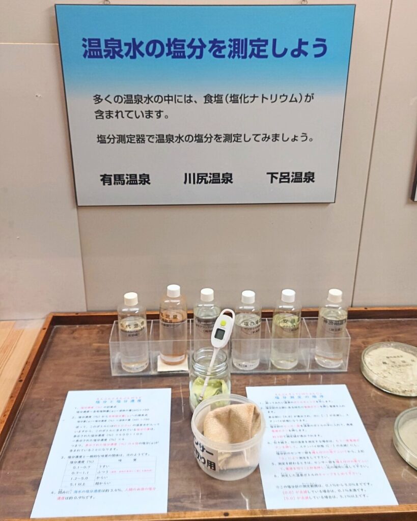 温泉博物館では湯の花を触ったり、酸性度(ph)を比べたり、お湯の色を見たりと体験を通した学びがあります。