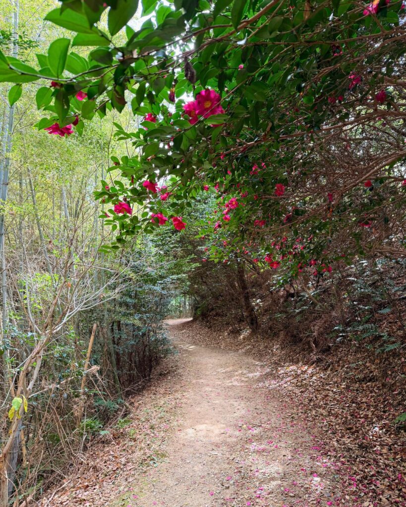 中でも東駐車場と、ロマン小径の駐車場寄りの入口近くに群生しています。このロマン小径の椿はトンネルになっているのでいい写真スポットになると思います。