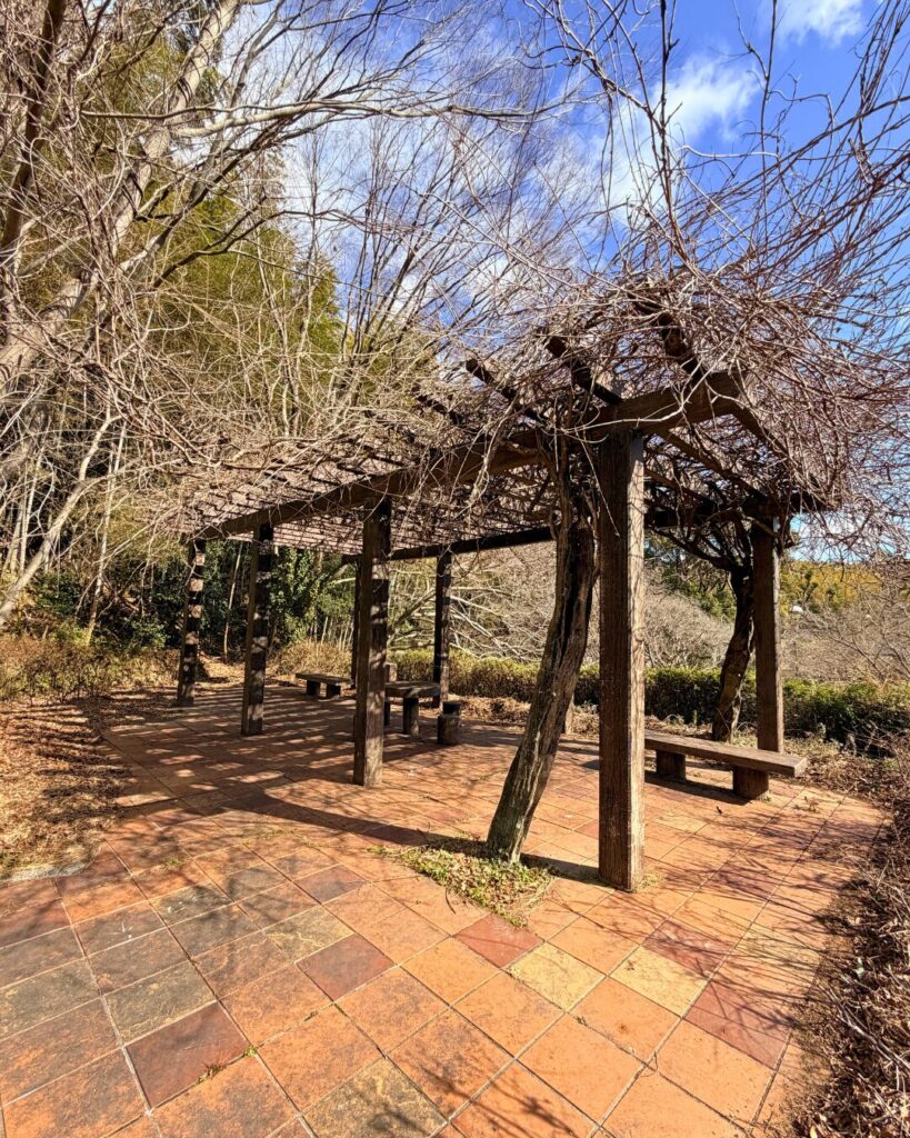 【東側駐車場近くの藤棚】ベンチやテーブルが園内にいくつか設置されています