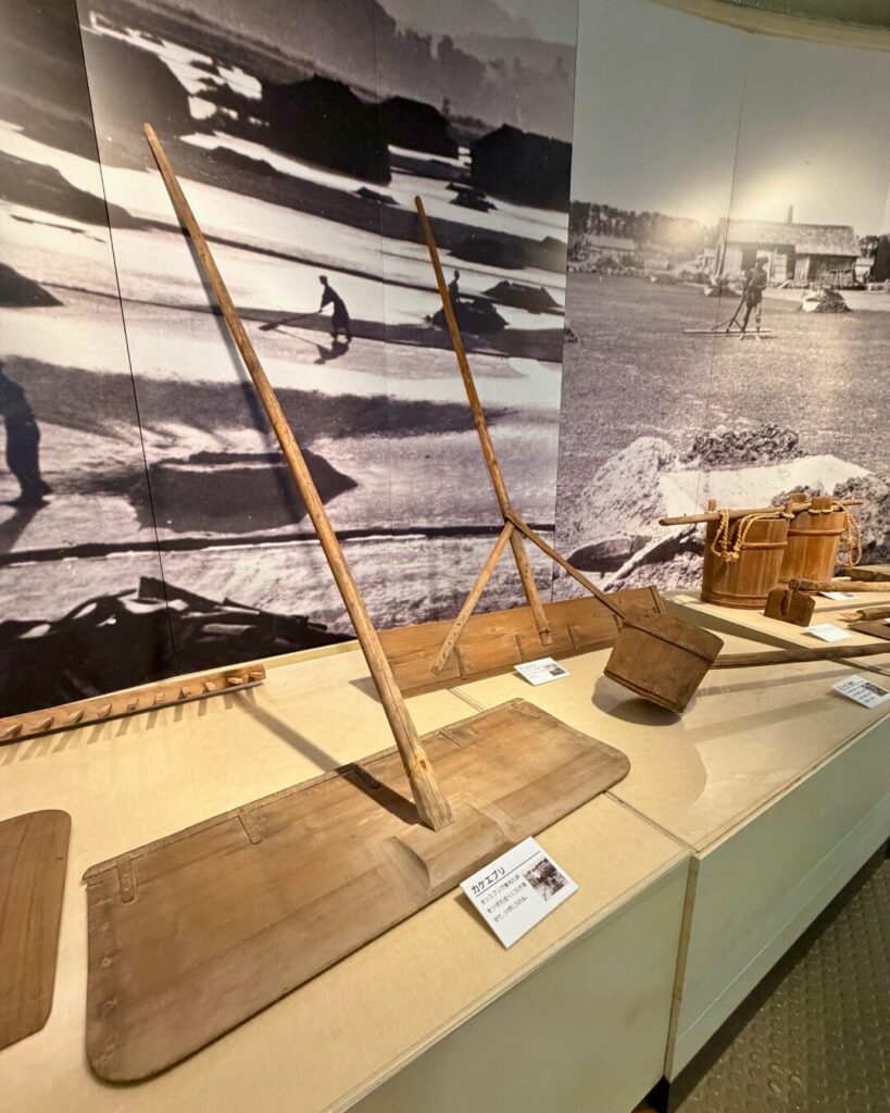 館内には、作業工程を紹介するパネルや模型、当時使われていた道具などが展示されており、製塩の移り変わりを具体的に知ることができます。