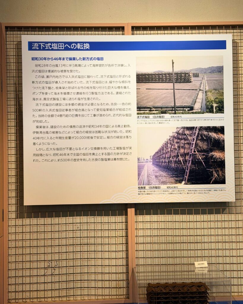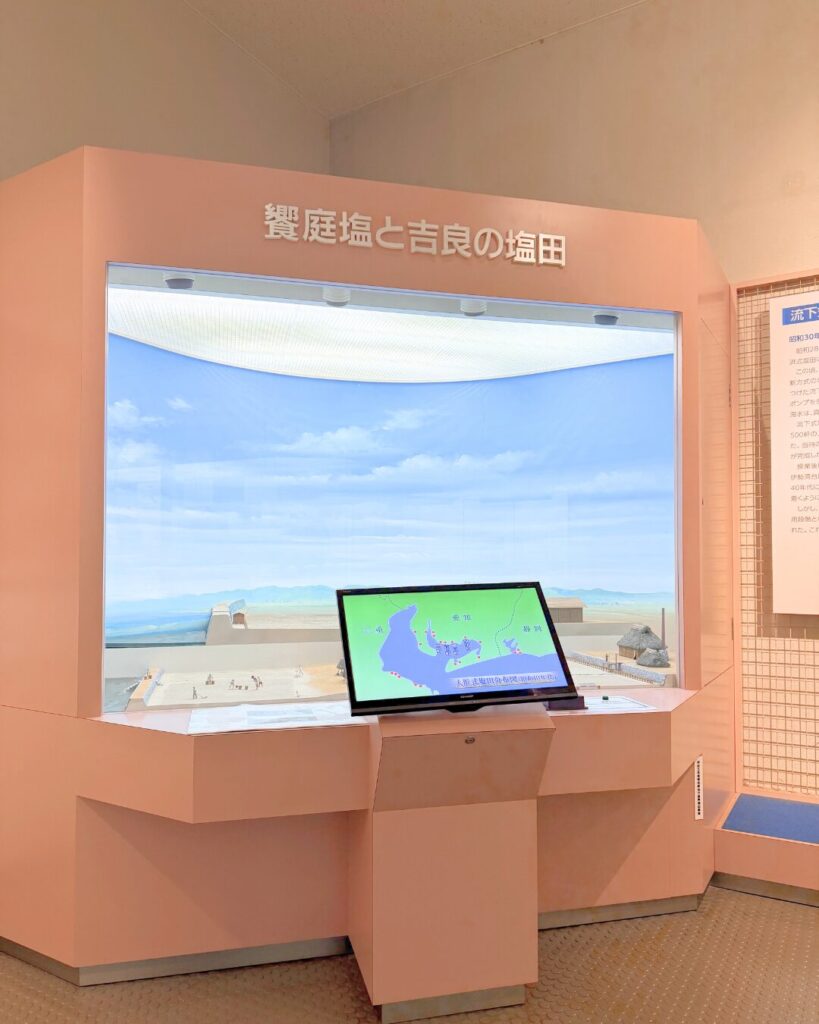 館内には、かつて行われていた入浜式塩田による製塩の様子や道具、写真資料などを展示。地域の製塩産業の歩みを知ることができます。