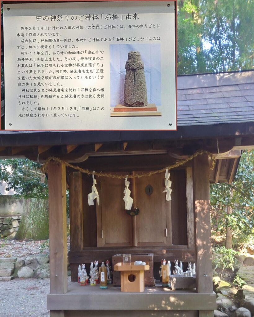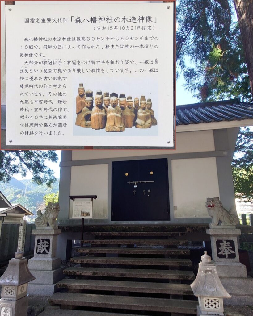 十躯の木造神像(国指定重要文化財)は宝物庫に、石棒(下呂市指定重要文化財)は校倉(あぜくら)造りの宝庫に安置されていますが普段は見られません。
