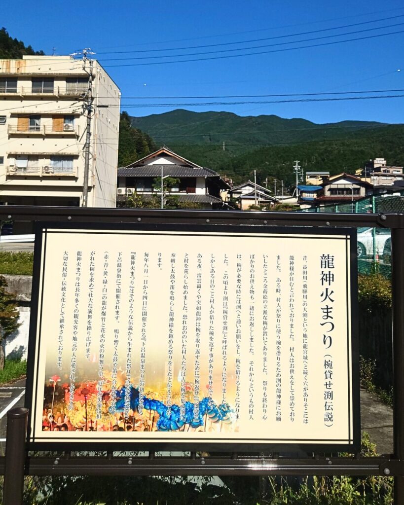 むかし竜神様が住むとされた穴があり、そこからきれいな椀を借りて使う習慣がありました。あるとき借りた椀を返さない者が現れて、竜神様が怒ったという伝説が竜神火祭りの謂れになっています。