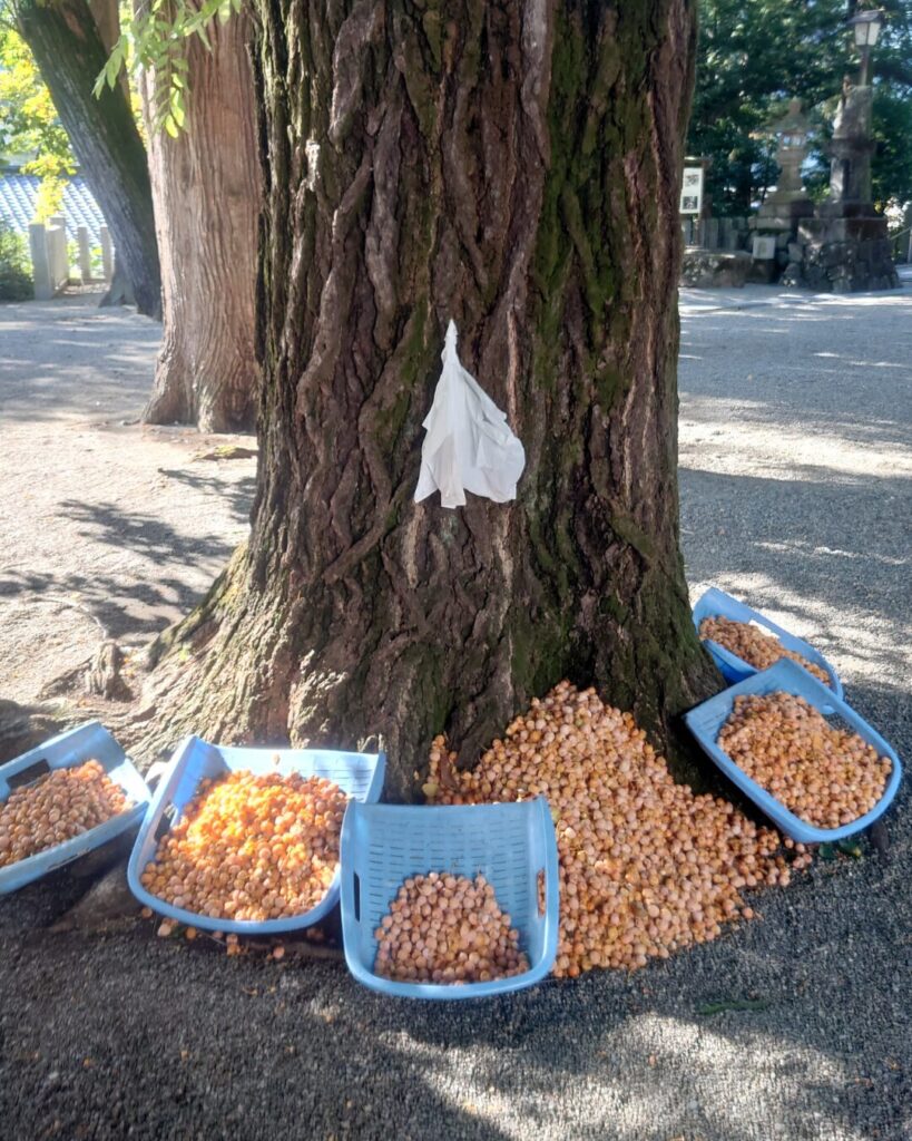 境内にあるイチョウの木の根元に銀杏の実が集められていました。ビニール袋が掛けられていたので持って行ってもいいのかもしれません。