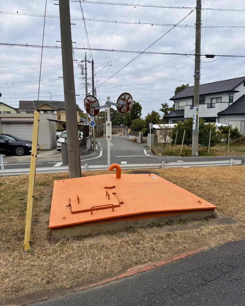 【大池公園へ向かう交差点】オレンジのふたが目印です