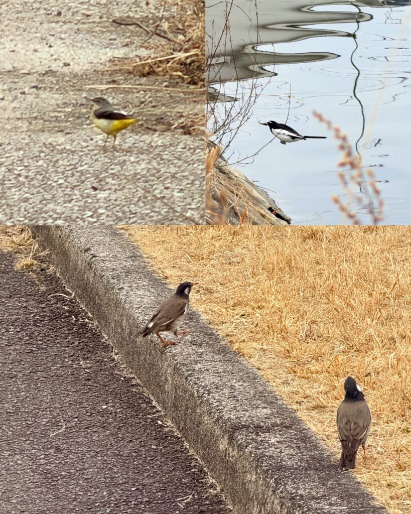 【セキレイ(左上)、セグロセキレイ(右上)とムクドリ(下)】