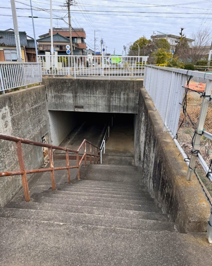 【アンダーパス】歩行者用の階段と自転車用のスロープのみですがアンダーパスをくぐれば信号を渡らずに済みます