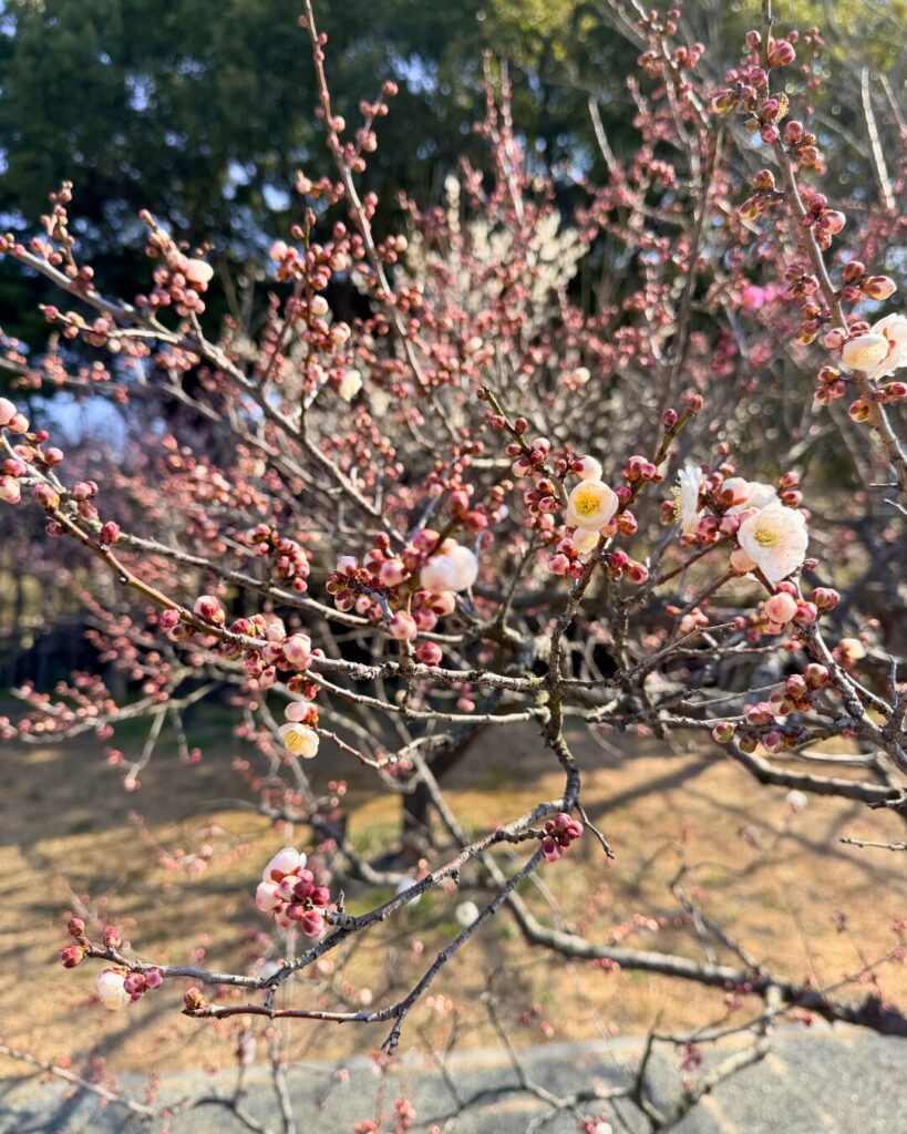この日は蕾から開花が進み始めたところ。まさにピーク直前といった印象でした。これから1〜2週間ほどは、満開の梅が楽しめそうです。