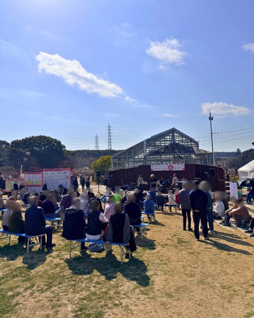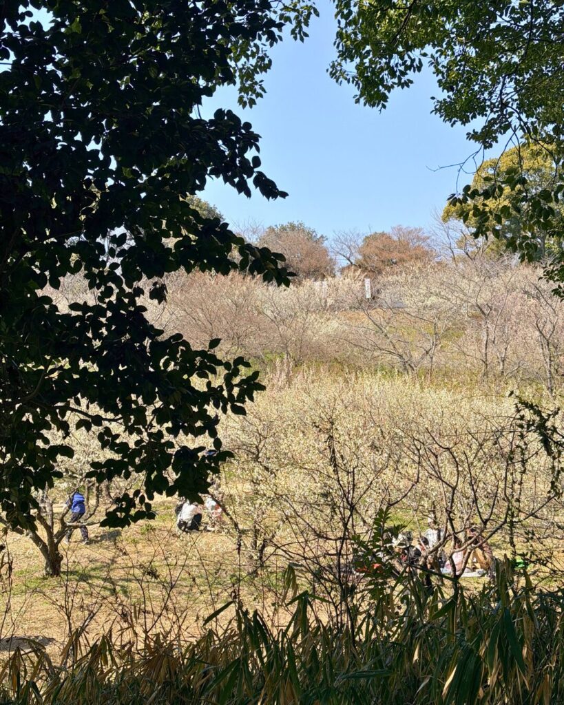 ふれあい広場は気持ちのよい芝生エリア。梅まつり期間中は混雑しますが、普段は比較的ゆったり過ごせます。