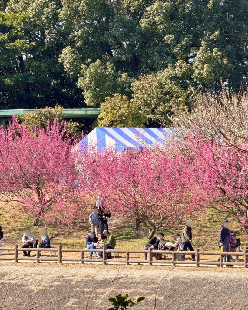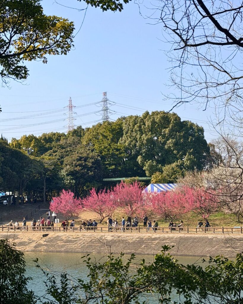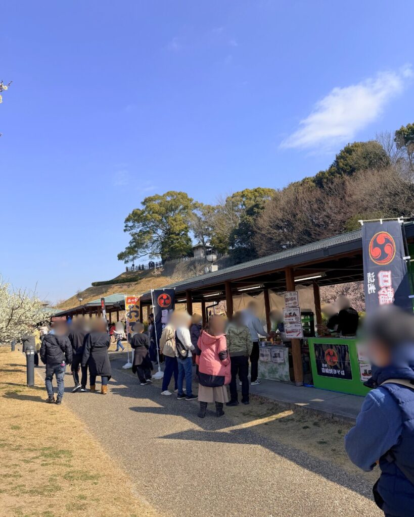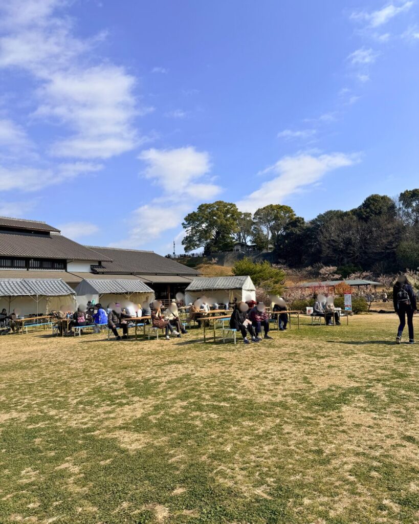 梅まつり期間中は、池沿いに並ぶベンチで屋台グルメを味わいながらのんびり過ごせます。水辺の景色とあわせて、ゆったりした時間が流れます。