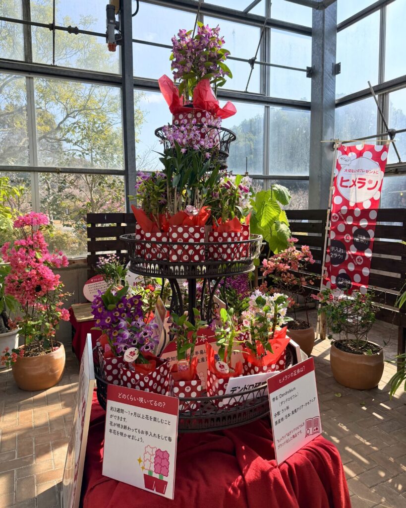 梅の館の向かいにある鑑賞温室では、色とりどりの花が楽しめます。この日のおすすめは蘭の花。園内の梅とはまた違った華やかさがあります。記念撮影に使えるベンチも設置されています。