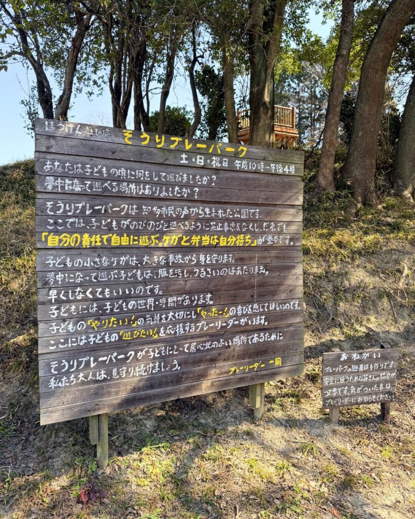 林間には手づくりの遊具が設置され、土日祝には木工体験や焚き火ができる「そうりプレーパーク」が開放されます。