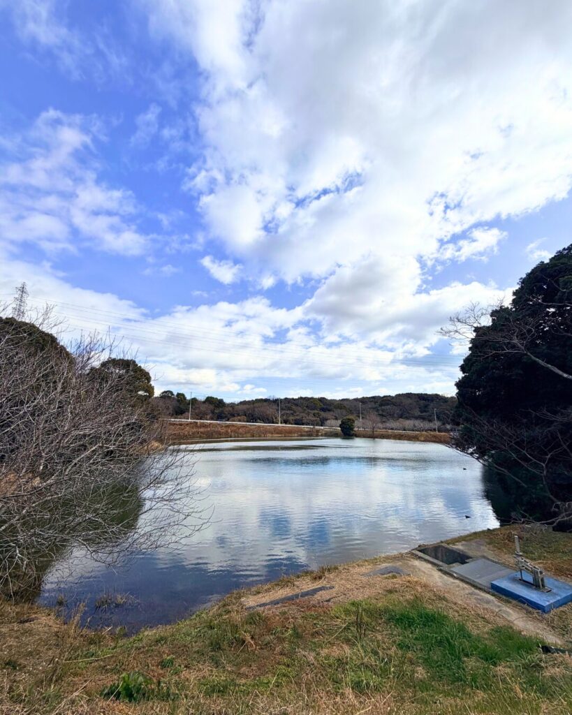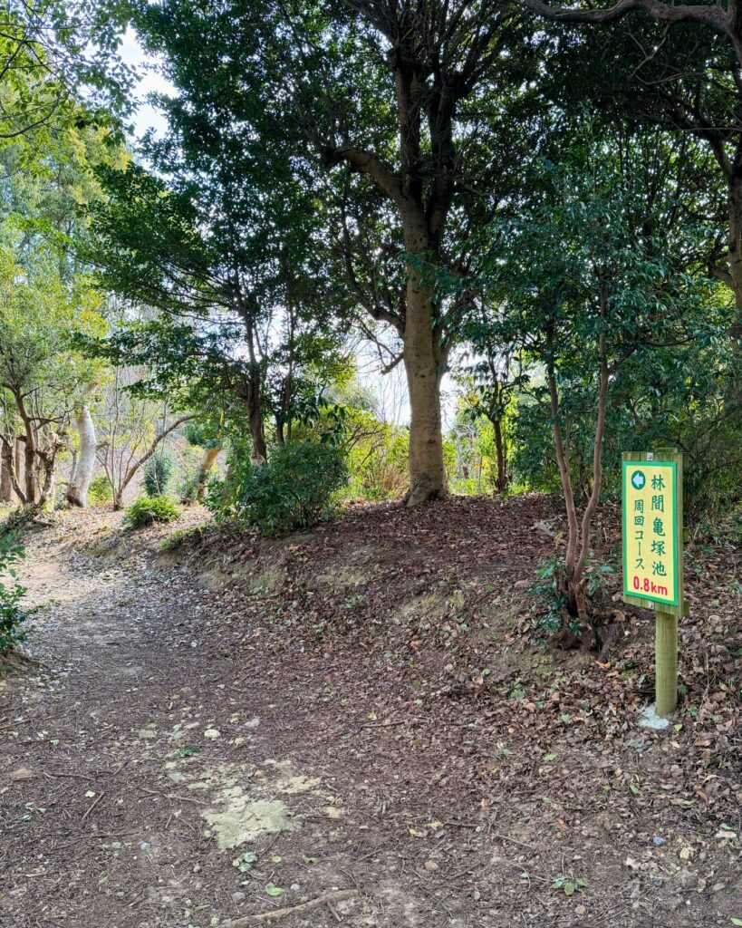 展望台左手の「三角点経由亀塚池周遊コース」から亀塚池まで歩き(約1km)、亀塚池を半周(約0.1km)、亀塚池から「林間コース」を通り展望台まで戻ります(約0.8km)。