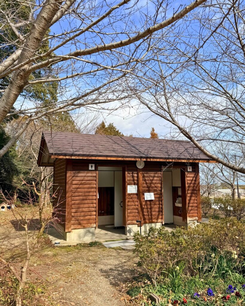 トイレは駐車場の横にあります。屋外のそこまで古さを感じない設備、便器は和式で清掃・トイレットペーパーの補充済み。
