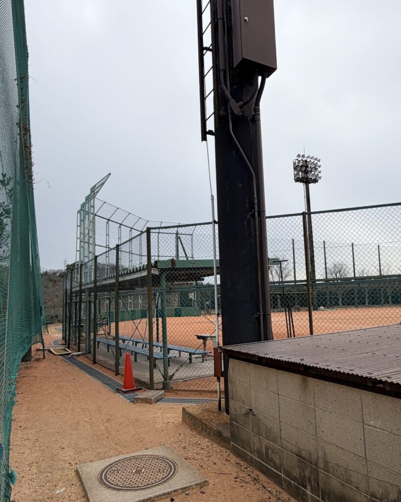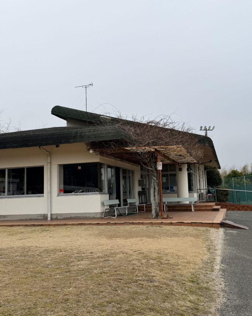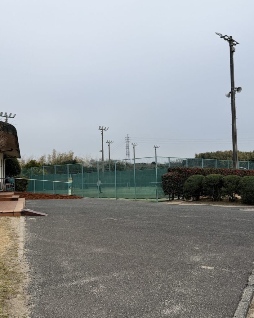 駐車場の目の前に広がっているのがグラウンドです。通路を進むと管理棟とテニスコートがあります。公園はテニスコートの反対側に位置しています。