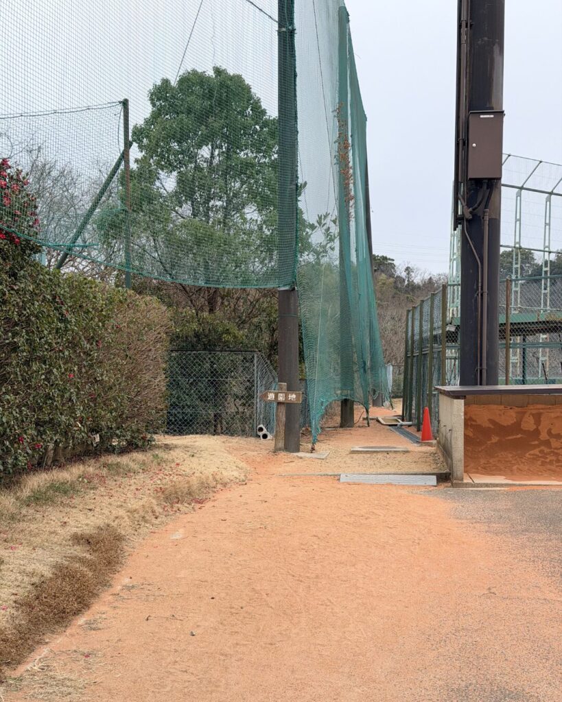 テニスコートを左手に見ながら進むと、「遊園地」と書かれた立て札が見えてきます。テニスコートに沿って通路を進むと、公園(遊園地)にたどり着きます。